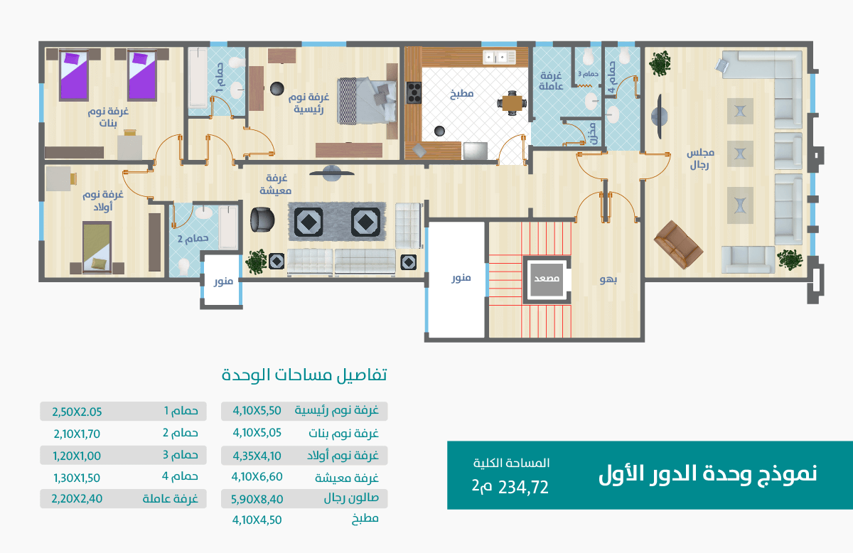 - مساحات كبيرة تتراوح بين 214 إلى 234 متر مربع لكل شقة.